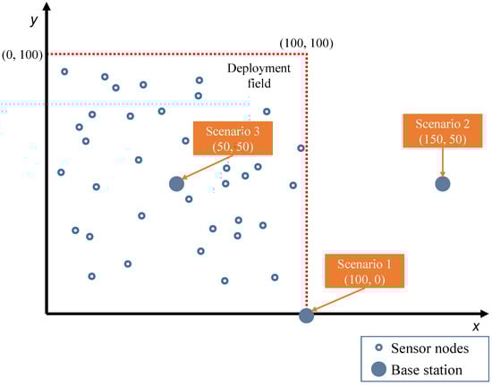 As mentioned above, the process used three typical WSN scenarios to optimize the weights of the rules, which were also used by other clustering methods for comparison. The dimensions of the node deployment area were the same for the three variants: a square area of 100 × 100 m2, where nodes were randomly placed. The number of nodes deployed was fixed for all scenarios (100 nodes). The main difference between the three scenarios was the location of the BS, which can be observed in Figure 5. The three scenarios can be identified as follows: