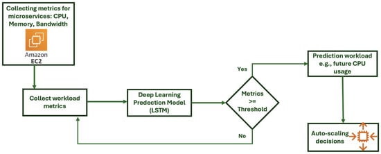 Figure 3 illustrates a real-time auto-scaling system based on deep learning that can forecast future workloads, such as the value of CPU, bandwidth, and memory. Furthermore, it demonstrates the process of collecting metrics from various microservices, such as AWS EC2 instances. However, the model forecasts the workload, and based on these predictions, the system decides to scale resources up or down automatically. To address the issue of estimating the right threshold value for microservices, the authors of [