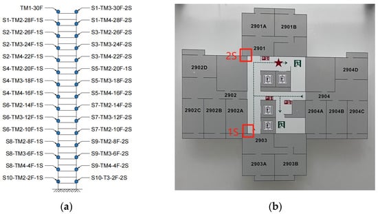The testing methodology involved using four available instruments to perform a series of tests, aimed at obtaining the modal shapes at 30 different locations in the building. As depicted in Figure 5, the solid dots in (a) represent the measurement points, labeled Sn to denote the nth setup. The abbreviations TM, F, and S represent the terminal, floor, and plane measurement positions, respectively. These measurement points are arranged uniformly in the vertical direction; horizontally, due to the need for GPS synchronization of the instruments, we chose to conduct tests at positions 1S and 2S, and this was done on each floor.