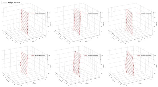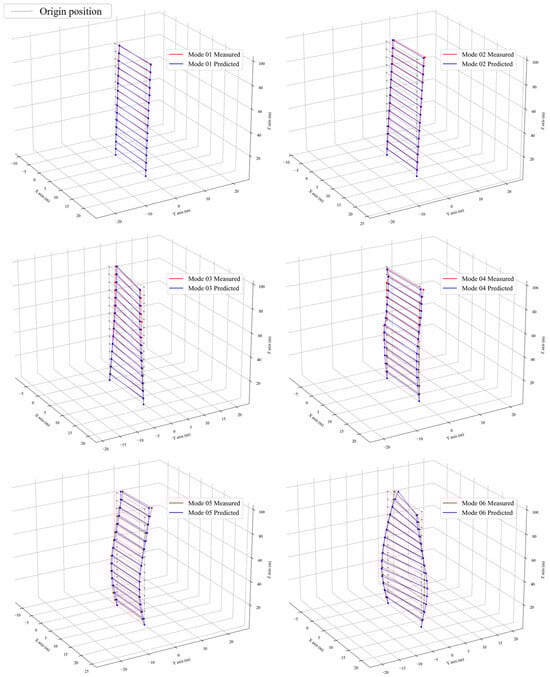 Upon finalizing the model using the DNNMU method, the predicted parameters were generated, specifically the elastic modulus. These parameters were then incorporated into the finite element model. Subsequently, a numerical modal analysis was conducted on this updated model to yield the modal parameters. The resulting values were compared with measured results. Table 5 illustrates the comparison between the updated calculated frequencies and the measured frequencies, along with the MAC matrix. Figure 12 presents the comparison of mode shapes.
