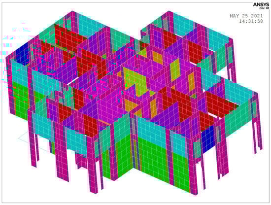 The numerical simulation portion of this study was performed using ANSYS 2021 due to its superior simulation performance and its flexibility in secondary development. A finite element model of the building was established based on design drawings provided by the design institute. Two models were constructed for this study. Model 1 includes only structural components such as shear walls, beams, and floors. Model 2, on the other hand, includes partition walls as shear wall units in their original positions. Model 1 was used to compare the results of the modal analysis. Subsequent model updating was conducted using Model 2, which was built based on Model 1 by adding the partition wall.
