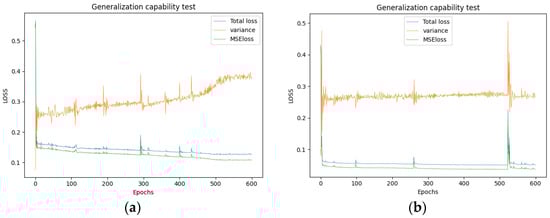 These samples were used as a validation set in the tests. At this point, if the computed loss value significantly increases after a certain number of epochs, it indicates that the neural network is overfitting in the region covered by the original probability density. The changes in loss after 600 epochs are displayed in Figure 11a,b. These figures use samples from the sample set as the validation set and incorporate a training set characterized by a wide parameter range.