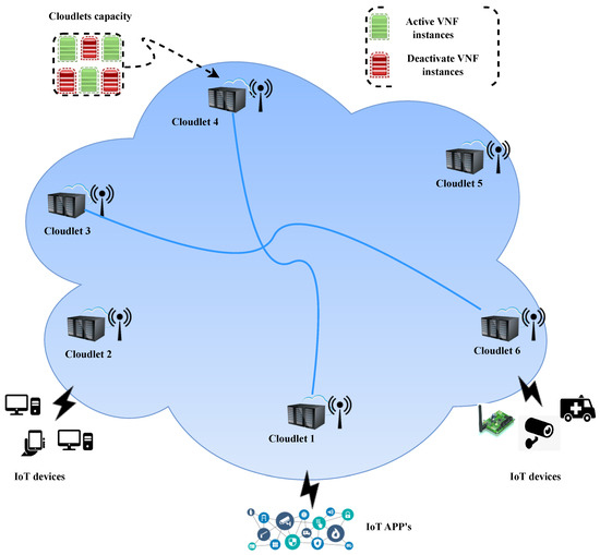 Consider a mobile edge computing network represented by in which denotes a set of access points (APs), i.e., and describes the set of edges in the network, i.e., . In this edge computing network, resource-limited cloudlets, denoted by , are placed at various locations close to users and are interconnected to perform end-to-end network slicing. Each cloudlet () has virtualized computing resources available as VNF instances to implement the different requested services in . Let and represent the set of various VNF instances at each , indicating the capacity () of in the form of activated () and deactivated () VNF instances. We assume that in each cloudlet (), a VNF instance () can be assigned to one IoT user request at a time, but the nature and demand of the user request need to be estimated in advance. Let denote the computing resource requirement of the VNF instance (). Additionally, we assume that the monitoring time period (T) is divided into equal time slots denoted by t and indexed by . A limited amount of bandwidth (B) is available for each cloudlet to transmit and receive data. Let and be the delay and bandwidth resource capacity of each edge () of the cloudlet (), respectively. The cloudlets () are interconnected with a set of links (). In , via , the cloudlets receive the network slice requests (), with delay requirements sent by users from various IoT devices to the nearest in that area. Figure 1 illustrates the MEC network, where APs with interconnected cloudlets have the capacity to provide end-to-end network slicing services to IoT users in the form of activated and deactivated VNF instances. The terminology employed in this paper is defined in Table 1.