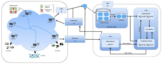 Agent : In the MEC system, each IoT user requests network resources. An agent, represented by , makes decisions based on available resources. It assigns the required resources to requests in the targeted cloudlet () and manages the entire process. These agents () are trained to utilize the MAgSAC approach, using their observations of the environment and action space to collectively achieve the optimal policy at each time slot (t).