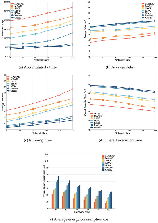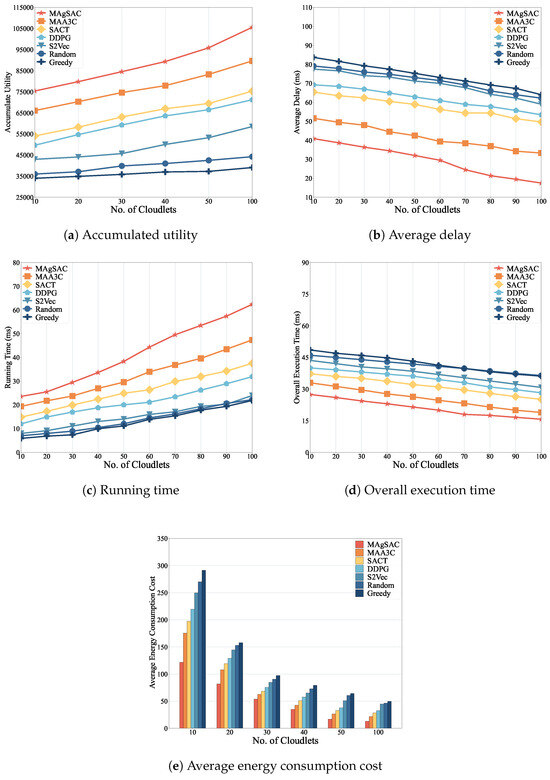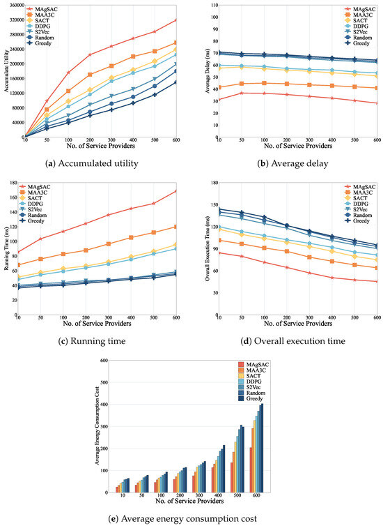- We conduct extensive simulations to compare our MAgSAC approach with benchmark methods, including MAA3C, SACT, DDPG, S2Vec, Random, and Greedy. The results indicate that our MAgSAC scheme achieves the highest utility with the lowest execution time, as well as minimum delay and energy consumption cost compared to the other approaches.