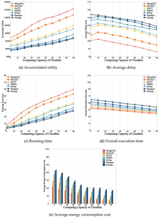 We further investigate the impact of increasing the computing capacity of the cloudlets on all the algorithms, as seen in Figure 6d. The findings demonstrate that when the computing capacity of the cloudlets improves, the overall time taken to implement the requests decreases. Each scheme exhibits a consistent pattern as a consequence of the enhanced computational capabilities of MEC networks. As the computing capacity of the cloudlets grows, our approach demonstrates a significant reduction in overall execution time compared to the other six algorithms, with an overall execution time 0.27% lower than that of , 1.2% lower than that of , 2.2% lower than that of , 6.5% lower than that of , 11.3% lower than that of , and 18.8% lower than that of .