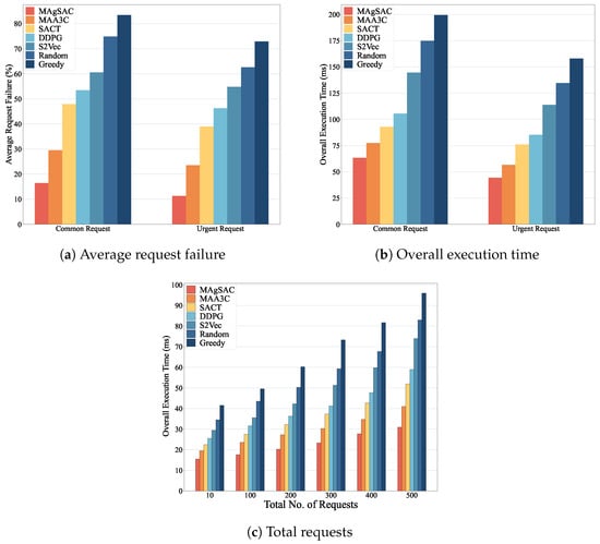 Figure 7 shows the impact of the number of requests on the performance of the , , , , , , and algorithms. The primary purpose of our approach is to facilitate both common and urgent IoT user requests as much as possible to minimize the failure percentage within the given time frame. Minimizing request failure is very important in emergency cases where an autonomous vehicle or real-time application needs a quick response. The common-request failure percentages of the seven comparison algorithms are slightly higher than those of the urgent-request algorithms, as seen in Figure 7a. However, our algorithm () has a request failure percentage that is 44.3% lower than that of , 65.7% lower than than that of , 69.2% lower than than that of , 72.8% lower than than that of , 78% lower than than that of , and 80% lower than than that of for common requests. For urgent requests, it is 52% lower than than that of , 71% lower than than that of , 75.5% lower than than that of , 79.3% lower than than that of , 81.9% lower than than that of , and 84.5% lower than than that of .