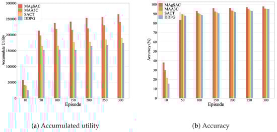 Finally, we evaluate the convergence performance of our proposed approach in comparison with three DRL-based benchmarks, namely , , and , based on MINIST [70], as shown in Figure 8. In Figure 8a, we can notice that the accumulated utility over the first 10 episodes is at the lowest level but gradually increases and starts converging to an approximate optimal point from episode 50 onwards. The , , , and algorithms all converge to a stable solution from episode 50 onwards, which means that as the number of episodes grows, the speed of convergence tends to increase for all the algorithms. While the and algorithms aim to maximize the estimated long-term return, their overall utility is slightly lower than that obtained by the other two algorithms, namely and . The notable enhancement of the proposed approach and the scheme may be due to the use of a maximum-entropy regularized stochastic strategy instead of a deterministic policy. Furthermore, our proposed algorithm clearly achieves more rapid convergence and superior utility, outperforming by 21.8%, by 38.7%, and by 51.8%. The proposed algorithm achieves convergence after around 50 episodes. The reason is that the proposed method allows for the efficient allocation of resources not only in the home cloudlet but also in adjacent cloudlets, thereby preventing the system from reaching a sub-optimal solution.