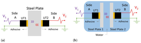 Figure 1a presents the model used in the tests, in which an electrical pulse, named V, excites one of the UTs coupled to the steel plate or the steel-water-steel assembly (Figure 1b). This UT transforms the electrical signal pulse into an ultrasonic wave propagating through the materials. After passing through this entire region, the receiving UT will receive this ultrasonic wave and transform it into an electrical signal [,].