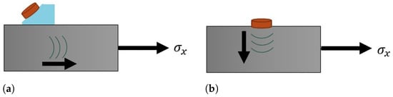 Schematic of the wave propagation. (a) Wave propagation parallel to the applied stress, i.e., stress x-axis () and ; (b) Wave propagation perpendicular to the applied stress, i.e., stress x-axis () and .