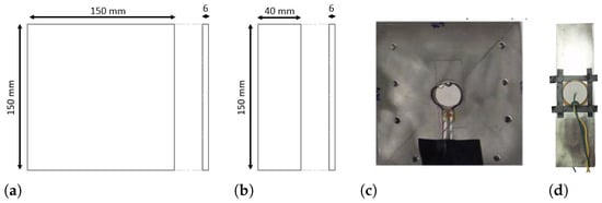 The dimensions of SP.1 are presented in Figure 3a. This specimen model is used in the temperature and temperature tests with variations in the positioning of the plates with fluid in the middle. Figure 3b shows the dimensions of SP.2 used in the strain tests. The cross-section of SP.2 is 40 mm × 6 mm, which results in a cross-sectional area of A = 240 mm2. The Young’s modulus for this stainless-steel is 200 GPa, so by applying this to Equation (5), it is possible to deduce that the maximum force in the specimen not to occur plastic deformation is 69.9 kN. This results in a yield strength of 291 MPa and a strain of 1456 . Furthermore, the SP.2 specimen was designed for the size of the ultrasonic transducer. However, due to limits in the geometry of the Instron machine used in the tests, this did not follow the standard norm for traction tests ASTM E8/E8M-9 [].