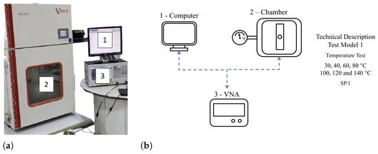 Schematic of the Test Model 1—the temperature variation test. (a) Photograph of the temperature variation test bench. (b) Test Model 1 diagram. (1) The test controller computer; (2) the climatic chamber in which the specimen is allocated; and (3) the vector network analyzer which sends and receives signals S21.
