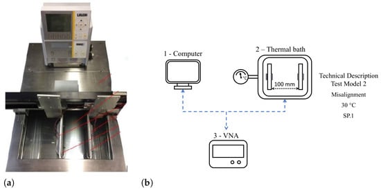 Schematic of the Test Model 2—the misalignment test. (a) Photograph of the thermal bath. (b) Test Model 2 diagram. (1) The test controller computer; (2) the thermal bath in which the specimen is allocated; and (3) the vector network analyzer which sends and receives signals S21.
