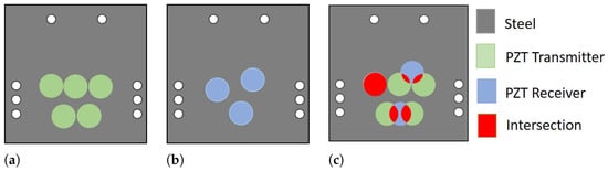 Representation of the instrumentation of the specimens for the alignment test. (a) The plate on the left, with five PZTs, is lined up in green. (b) Right plate, with three unaligned PZTs in blue. (c) The left and right plates overlapped, whereas red was the overlapping area. The white dots represented are spacers for centralizers to align the plates.