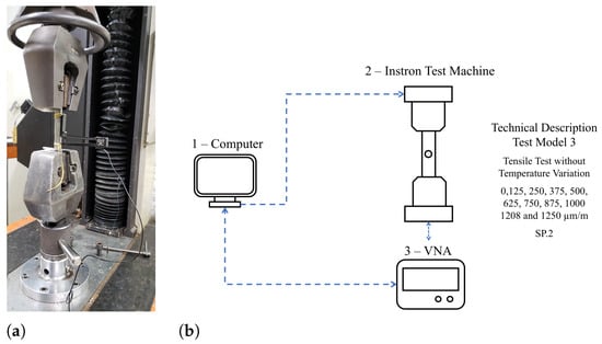 Schematic of the Test Model 3—the tensile test without temperature variation. (a) Photograph of the tensile machine Instron, model 8502. (b) Test Model 2 diagram. (1) The test controller computer; (2) Instron model 8502; and (3) the vector network analyzer which sends and receives signals S21.