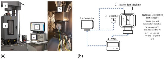 Schematic of the Test Model 4—the tensile test with temperature variation. (a) Photograph of the Instron—model E10000; (b) Test Model 2 diagram. (1) The test controller computer; (2) Instron model E10000; and (3) the climatic chamber coupled to the Instron machine; (4) the vector network analyzer which sends and receives signals S21; (5) zoom-in on the test specimen inside the thermal chamber coupled to the Instron machine.
