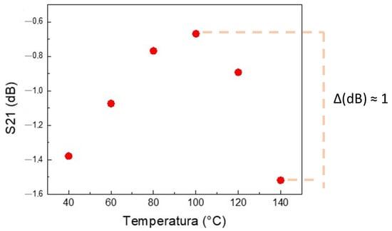 For the temperature range between 40 and 100 °C, S21 increases continuously, from −1.4 to −0.65 dB, with a variation of +0.71 dB, indicating that for this transducer/test specimen set, there is a small improvement in signal transmission up to approximately 100 °C. Above 100 °C, the transmission efficiency between the transducers declines rapidly. However, communication is maintained up to the maximum tested temperature of 140 °C, with a signal decay of approximately −1 dB, as indicated in Figure 9.