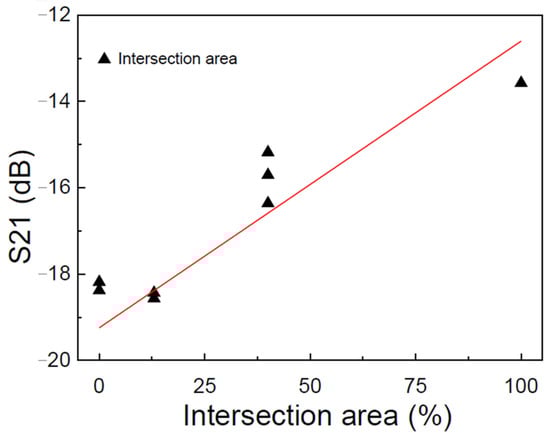 Another consideration is the intersection of areas. Communication between transducers is optimized when the transmitter and receiver are perfectly aligned horizontally. The data in Figure 10 show that the signal decreases as the intersection decreases. Parameter S21 is close to −13 dB at the 100% intersection. For the 40% intersection, it is around −15 dB. However, there is still communication between the transducers. For the 12.5% intersection, the signal starts to diffuse close to −19 dB, and for the 0% intersection, the result also maintains this value. The result is then considered no longer to have good ultrasonic communication for these values. In addition, it proves that the more horizontally aligned the devices are, the better the ultrasonic communication and data transmission. The red line on Figure 10 emphasizes a linear relationship between parameter S21 and the intersection of the area, showing a uniform decay of S21 as the misalignment of the transducers worsens.