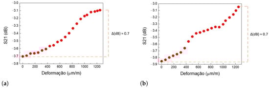 Model 3 test results—values that maximize the parameter S21 (dB) by the mechanical deformation exerted (m/m). (a) Test Model 3-1, where the variation in parameter S21 from the undeformed state to the maximum strain state was approximately 0.7 dB. (b) Test Model 3-2, where the variation in parameter S21 from the undeformed state to the maximum strain state was approximately 0.7 dB.