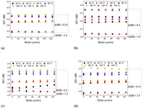 Test Model 4 result—values that maximize the parameter S21 (dB) by the strain () and the temperature variation. Each color in the graph represents a different temperature, and each point a different strain. (a) Test 4-1: The S21 for the strain influence is +0.15 dB, and the maximum variation in parameter S21 is −1.3 dB for 100 °C with strain and 140 °C without strain. (b) Test 4-2: The S21 for the strain influence is +0.1 dB, and the maximum S21 is −1.4 dB for 100 °C with strain and 140 °C without strain. (c) Test 4-3: The S21 for the strain influence is +0.2 dB, and the maximum S21 is −1.3 dB for 100 °C with strain and 140 °C without strain. (d) Test 4-4: The S21 for the strain influence is +0.15 dB, and the maximum S21 is −1.4 dB for 100 °C with strain and 140 °C without strain.
