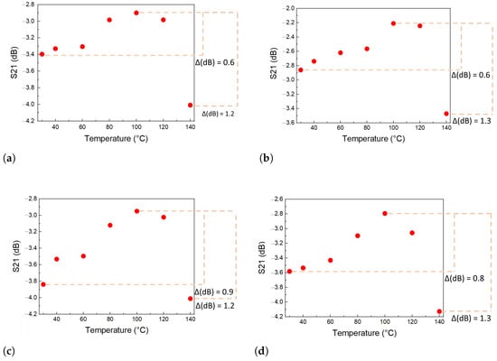 Test Model 4 result: values that maximize the parameter S21 (dB) by the temperature variation compensating for the deformation factor, where each point corresponds to a different temperature. (a) Test 4-1: Variation in parameter S21 from ambient temperature to the temperature that maximizes signal S21 (100 °C) is 0.5 dB, and the rapid decay of the parameter after 100 °C to 140 °C, where the dB is 1.2 dB. (b) Variation in parameter S21 from ambient temperature to the temperature that maximizes signal S21 (100 °C) is 0.6 dB, and the rapid decay of the parameter after 100 °C to 140 °C, where the dB is 1.3 dB. (c) Test 4-3: Variation in parameter S21 from ambient temperature to the temperature that maximizes signal S21 (100 °C) is 0.9 dB, and the rapid decay of the parameter after 100 °C to 140 °C, where the dB is 1.2 dB. (d) Test 4-4: Variation in parameter S21 from ambient temperature to the temperature that maximizes signal S21 (100 °C) is 0.8 dB, and the rapid decay of the parameter after 100 °C to 140 °C, where the dB is 1.3 dB.