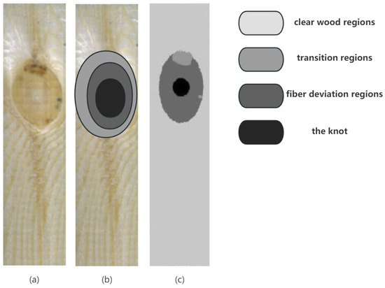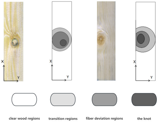 The sample and area schematics are shown in Figure 1. According to the research of Hu and Christoph Hackspiel [37,38], the fiber growth direction on the plate gradually changes from parallel to the plate surface to surrounding defects at an angle with the plate surface. According to the fiber trend of the board, the area where the fiber growth direction is parallel to the X axis is defined as the net wood area, the area where the fiber growth direction is parallel to the XY plane but has an angle with the X axis is defined as the transition area, the area where the fiber growth direction has an angle with the XY plane is defined as the fiber deviation area, and the defect is defined as the knot area.