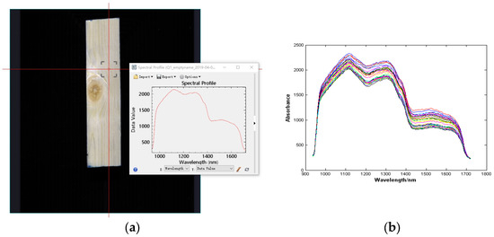 Larch sample boards with a size of 200 × 50 × 20 mm were used in the experiment and were conditioned to an equilibrium moisture content at 65% relative humidity and 20 °C before all tests. The spectral acquisition equipment was a Finnish SPECIM industrial hyperspectral camera FX series, with a wavelength range of 935.61~1720.23 nm, a spectral resolution of 3.45~3.58 nm, and a total of 224 bands. The near-infrared spectrum camera carried out linear array push-broom type data acquisition on the larch wood defect board sample, so that the board surface image was in one-to-one correspondence with the spectrum data by taking a pixel point as a unit. According to that plate image, the corresponding spectral data were exported and stored in different areas.