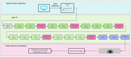 To improve the efficiency of wood utilization and the accuracy of performance prediction, researchers have adopted a variety of techniques to study its internal structure and defects. Among them, near-infrared spectroscopy (NIR) has become an important tool to identify and distinguish the internal structure of wood because of its non-destructive and efficient characteristics. [6,7]. Isik et al. combined NIR analysis with a least squares support vector machine to quickly predict wood density and mechanical strength and achieved excellent results [8]. Olsson et al. proposed to measure the fiber angles on the surface of solid wood using laser imaging techniques to predict the status of wood defects and estimate the associated mechanical properties [9,10,11]. Most studies have focused on the mechanical analysis of defect-free samples and defect types, as well as from the perspective of spectral feature optimization and nonlinear modeling. In terms of the board mechanical property test, T Janiak studied the mechanical properties of solid deciduous wood with different moisture contents [12], S Yang confirmed that the mechanical properties of mixed CLT and wood were improved [13], and S Gayda made statistics on the results of the physical and mechanical properties of wood at different ages [14]. SA Huse studied the genetic variation of wood mechanical properties of Eucalyptus clones [15]. These studies show that NIR spectroscopy can provide internal information from a microscopic point of view, which can help identify fiber orientation and defect location. However, the traditional NIR detection method still lacks sufficient description and quantitative analysis of the board morphology and cannot accurately describe the structure and predict the mechanical properties of defective boards. In recent years, deep learning, especially convolutional neural networks (CNNs), has performed well in image classification and pattern recognition [16]. The VGG network is a classic deep convolutional neural network architecture, which can extract multi-level features from images [17]. By combining the one-dimensional convolutional neural network (1D-VGG), NIR spectral data can be effectively classified. Z Wan used VGG for near-infrared spectral classification of Pinus [18], X Xu used near-infrared spectroscopy and GAF-VGG Net to identify the origin of corn seeds [19], and I Işık completed the classification of wheat varieties [20]. AK Sharma used an improved VGG model-based transfer learning method to classify brain tumors [21], C Can used two-dimensional near-infrared images for gesture recognition [22], A Shukla’s application was used in plant phenotyping RGB images for high-resolution near-infrared prediction [23], L Gopinath found a dimensionality reduction method for near-infrared and visible image fusion [24], Y Hong used VGG to fuse NIR and RGB image features to eliminate reflection [25], and Z Dong used a convolutional neural network to classify mango varieties [26]. S Sharma used near-infrared hyperspectral imaging combined with machine learning to evaluate the physical and chemical quality of durian pulp [27], D Mohapatra completed a precision agriculture fruit recognition and grading system based on a deep neural network [28], and SM Hassan used a shallow convolutional neural network for plant disease recognition [29]. Pouyet et al. classified pigments in the short-wave infrared range [30], and Chen et al. completed object recognition modeling for newborn chicks using CNN [31]. Chen et al. used the Resnet50 algorithm to identify the storage time and species of sliced Boletus [32], and DJ A used Resnet and Youjin infrared spectroscopy technology to establish a new classification model for tobacco planting areas [33]. These achievements show that although deep learning, especially VGG, is excellent in image classification and pattern recognition, its application in the field of wood is not yet widespread, and further research and validation are needed. Finite element analysis, which models nonlinear wood by numerical approximations, has been applied mostly to the effects of heterogeneity in wood material distribution under a variety of stress and strain fields [34,35]. Hu et al. proposed a microstructure-based multi-surface failure criterion to describe the brittle and ductile failure mechanisms of wood, but they described the defect as a cone and did not divide the wood regions [36]. Christoph Hackspiel divided the wood into four regions according to the fiber trend of wood: knot region, fiber deviation region, transition region, and net wood region, and simulated the stress of double-knot wood by the finite element method. However, they did not accurately define the transition zone and the fiber deviation zone [37]. Kiraly T modeled the growth ring of Norway spruce wood beams in the finite element calculation [38], and Sobczak-Pi Piąstka J simulated glulam beams in the case of oblique bending [39]. However, most of the existing finite element analyses of wood morphology and mechanical properties involve the construction of homogeneous material regions or simple morphological descriptions, failing to accurately define regions and analyze internal structural changes and mechanical mechanisms.