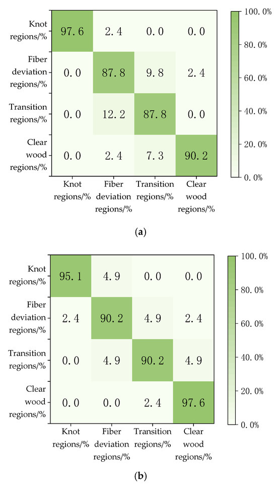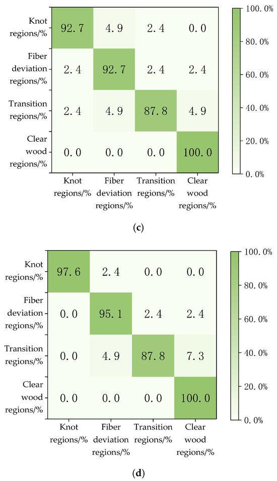 The results in Table 4 show that using the VGG19 classification method, the identification accuracy of the knot area is 95.1%, the fiber deviation area is 92.7%, the transition area is 90.2%, the net wood area is 100%, and the average accuracy is 94.5%. The VGG19 algorithm can effectively classify the transition zone, fiber deviation zone, and net wood zone of wood, but the accuracy of the transition zone is slightly lower. Understanding irregular growth defects has a positive effect on the study of wood stiffness and strength, which can help to bring economic benefits to higher grade and higher yield wood producers.