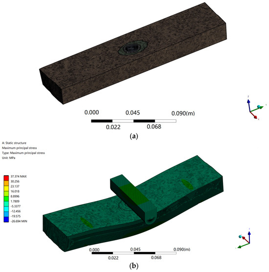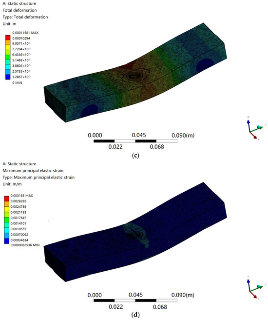 UG 3D-modeling software was used to build a 3D model according to the inverted figure of the specimen, and then imported into Ansys Workbench through the common interface. The physical properties of the model are determined by the three parameters of Young’s elastic modulus, Poisson’s ratio, and material density, and the finite element model is created by meshing, as shown in Figure 8a. Constraints, including boundary and initial conditions, are applied, fixed supports are applied on both sides of the material, loads are applied, and solution control options are set as shown in Figure 8b. After you optimize the meta-analysis, you can view, analyze, and verify the results of the solution. The calculation results can be displayed by color nephogram and contour map, and the total deformation and maximum elastic strain are shown in Figure 8c,d. Table 5 is a comparison of the prediction values of different methods, and Table 6 is a comparison of the evaluation indicators of the prediction values of different methods.