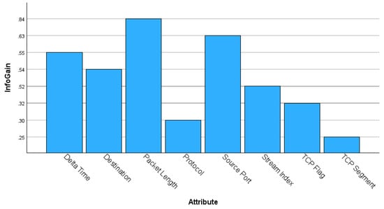 The inclusion of an information gain ranking process for eight common attributes afforded a valuable insight into the importance of the lp and attributes. Figure 3 displays the ranking for each attribute with lp ranked highest at and ranked third at . It should be stressed that while the source port is a commonly selected feature, as seen in [], and occurs in many DoS datasets including Bot-IoT [], this attribute can be problematic, and may cause misleading results or classification errors due to it being tightly associated with a unique node.
