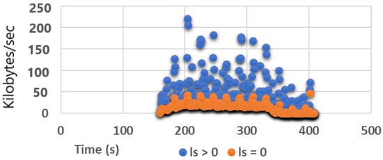 To validate the hypothesis that Slow DoS exhibits a higher proportion of packets where ls = 0, an evaluation was performed on the CIC-IDS2017, intrusion-detection dataset [], with results proving convincingly that for both constituent Slow DoS dataset variants, namely Slow HTTP Test and Slowloris (SG), a higher percentage of packets where ls = 0 was discerned for lp ∈ {60, 74}.