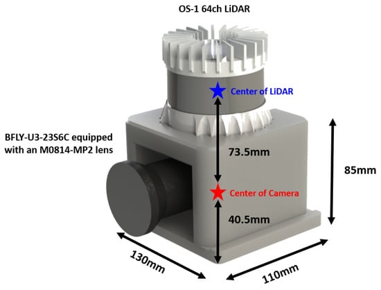 The LiDAR sensor used for snow point extraction was an OS-1 64ch LiDAR (Ouster Inc., San Francisco, CA, USA), and the rotation rate, vertical resolution, and horizontal resolution were set to 10 Hz, 64 ch, and 1024 pts, respectively. Accordingly, a total of 65,536 points were obtained per scan. In addition, given the difficulty of accurately checking the weather using only a LiDAR sensor at the time when the snow data were acquired, a vision camera was used to check the weather. A Blackfly BFLY-U3-23S6C (Teledyne FLIR, Wilsonville, OR, USA) equipped with an M0814-MP2 (Teledyne FLIR, Wilsonville, OR, USA) lens was used for the camera, and the resolution and FPS were set to 1024 × 720 and 30, respectively (Figure 2). The camera was not installed to fuse with the LiDAR but to check peculiarities in the weather (changes that are difficult to identify with LiDAR, such as snow, rain, or hail) or noise caused by unknown objects such as leaves and plastic bags. Finally, snow datasets were obtained by connecting the LiDAR and camera to a laptop using the Robot Operating System (ROS1) middleware program. The laptop computing hardware was an Intel(R) Core(TM) i7-10870H CPU @ 2.20 GHz with 32 GB of RAM.