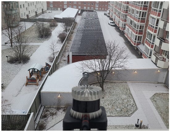 Figure 3 shows the location where snow data were acquired in Luleå, Sweden, and Figure 4 shows a sample of the acquired data. The data were collected from the 4th floor of a building with no objects within 120 m in front of the effective detection distance of the LiDAR sensor for snow extraction. The reason why the voxel location was selected as an object-free area on the 4th floor was to ensure that only snow points would be extracted in this area. If there is an object in a given area, the number of snow points sensed will decrease in proportion to the volume of the object; therefore, to extract the exact number of snow points within the designated voxel size, it is necessary to select an area without any objects present as a default. In particular, the data collected by drones driving in the air or ships driving at sea are often ideal because it is very likely that there are no objects in the voxel area. Initially, it was expected that there would be many variations in measuring the number of snow particles caused by the wind in such an open space, especially in the voxel area in the air. However, even in an environment where various wind directions and wind speeds change randomly during an actual snowfall measurement experiment, the speed of the wind was not a problem at all in measuring the number of snow points because the light speed of the LiDAR beam was extremely fast. Similar to the data acquired in Luleå, in South Korea and Denmark, snow data were obtained at locations with sufficient voxel spaces for snow extraction.