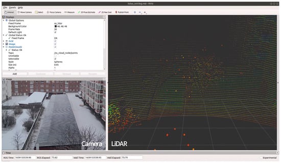 Sample data visualized through the ROS RViz. The camera image was used to visually check the noise caused by unidentified objects, such as leaves, plastic bags, and other garbage, not snow.