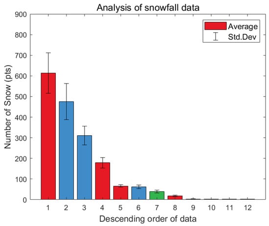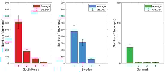 Figure 6 shows the results of snow extraction from the four data samples acquired in South Korea, Sweden, and Denmark. As the average number of extracted snow particles increases, the standard deviation also increases, and accurate values for each sample are shown in detail in Table 3. Snow data collected from South Korea and Sweden were not only gathered during ordinary snow events but also on days with heavy snow advisories and warnings. This resulted in snow records where the number of snow particles extracted from the 5 × 5 × 5 m voxel exceeded 400 per frame. Additionally, dry snow records were obtained because it snowed at a very low temperature of −10° [36].