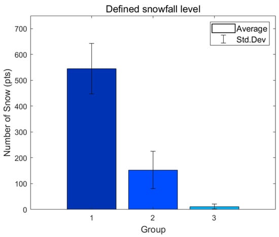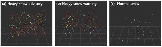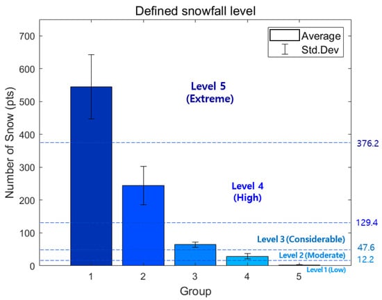 A snowfall level criterion through the snowfall forecast and the measurement of the number of snow particles through LiDAR was established. This is essential information to identify local snowfall information in the area where the vehicle is located, and it is a new criterion because it is the first method of classifying snowfall by considering the amount of snow measured through LiDAR and the weather forecast. This cannot be replaced by weather station information that predicts for a wide range of regions. The snow data obtained during a heavy snow advisory or a period of red snow warning were classified into the first group, the snow data obtained during a heavy snow warning or a period of orange snow warning were classified into the second group, and the data obtained on a day with no snow forecast or a yellow snow warning were classified into the third group.