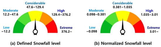 The upper range was calculated as the average of the value obtained by subtracting the standard deviation from the mean of the upper group and the value obtained by adding the standard deviation from the mean of the corresponding group. Similarly, the bottom range was calculated as the average of the value obtained by subtracting the standard deviation from the mean of the corresponding group and the value of adding the standard deviation from the mean of the lower group. Finally, five snowfall levels were defined: extreme, high, considerable, moderate, and low. The range of snow particle counts for each snowfall level is shown in Figure 11 and in Table 7. Figure 11b and range (b) in Table 7 are the data normalized to 1 × 1 × 1 m; these results can be applied to voxels of various sizes when implementing the system in practice.