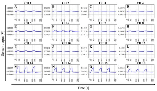 The computer unit, analog signal converter board, and 16-channel sensor chip of the odor sensing system were provided by Panasonic Industry Corp (Tokyo, Japan). The GC materials of the sensor array are shown in Table 1. In the table, the McReynolds constant represents the polarity of the GC materials [43,44]. CB was sourced from Sigma-Aldrich Japan G.K. The GC materials and CB were mixed using tetrahydrofuran (THF) (Sigma-Aldrich, St Louis, MO, USA) as the solvent applied to the 16-channel sensor array chip using a reagent spotting system (SPOT MASTER, Musashi Engineering, Tokyo, Japan). After one hour of annealing at 170 °C, the sensor array was installed onto the system’s baseboard in a polytetrafluoroethylene (PTFE) chamber.