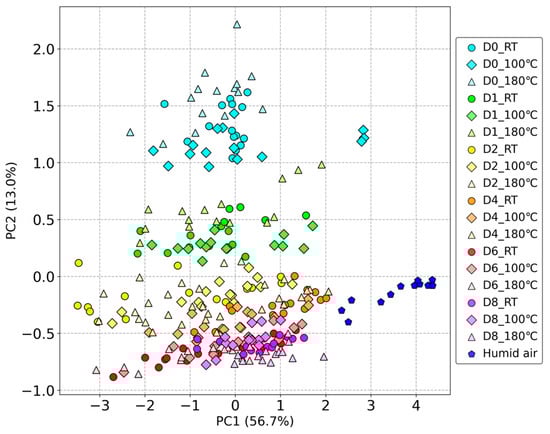 After feature extraction, the 240-dimensional feature data were visualized using PCA dimensionality reduction, as shown in Figure 3. We normalized the data using Min–Max Normalization before the dimensionality reduction. The results of the PCA show that on the right side of PC1 are the reference gases adjusted for humidity, while on the left are the beef odor samples. In PC2, the distribution of the data from bottom to top reflects the changes in storage days. There is a clear separation between D0 and D1 and other dates, while on D6 and D8, the data points are intermixed within the same region. The differences due to different processing temperatures can be observed to some extent but are not as significant as the differences in storage days. The cumulative contribution rate of PC1 and PC2 is 69.7%, indicating a considerable loss of information when reducing the data to two dimensions using PCA. Higher-dimensional data may be needed for better classification results.