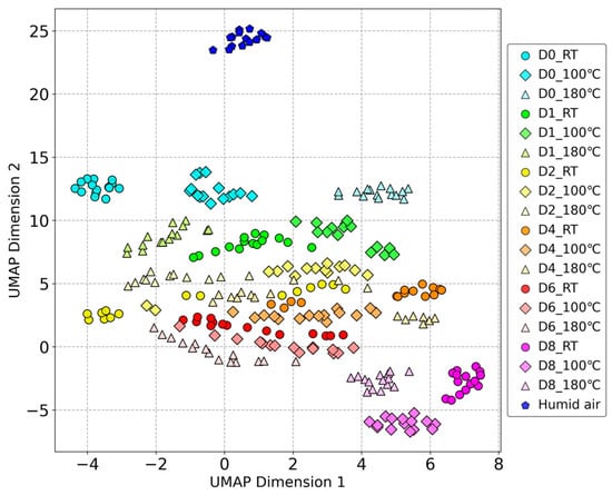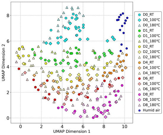 The results of the dimensionality reduction using unsupervised UMAP are shown in Figure 4. There is a correspondence between the data distribution in the PCA and that in the unsupervised UMAP. The results of the reference gases adjusted for humidity also maintained a certain distance from the beef odor samples. Compared to PCA, UMAP provides better differentiation between storage days, and the data are distributed according to the storage duration. The differences, particularly between D4 and D8, are more pronounced. However, the clustering of different processing temperatures did not improve compared to PCA.