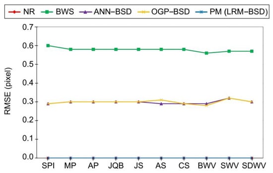 According to Figure 3, Figure 4 and Figure 5 among the compared methods, it can be observed that the NR and LRM exhibit superior accuracy, characterized by the RMSEs approximately zero. Subsequently, the OGP and ANN present the RMSEs of about 0.3 pixels. The BWS demonstrates the greatest level of RMSE, with a recorded value of 0.6 pixels. Furthermore, the BWS exhibits the most considerable computational time, amounting to 1300 s, due to the necessity of more repetition of the CE for each ground point across all images. The NR follows closely in terms of time consumption, requiring 500 s, which is the second longest duration after BWS. This issue can also be ascribed to the iterative application of the CE; however, it is noteworthy that the frequency of repetitions for the NR is lower than that of the BWS. In contrast, the OGP demonstrates an average execution time of merely 7 s, while both ANN and LRM exhibit equivalent processing times ranging from 2 to 3 s. It is essential to highlight that the RMSE of the LRM is very close to zero, whereas the RMSE of the ANN is approximately 0.3 pixels. Additionally, the behavior of the drmax can be inferred from the RMSE values. Consequently, the BWS, characterized by the drmax equivalent to one pixel, exhibits the maximum error in comparison to the other methods. The LRM and NR, both exhibiting the drmax values of approximately zero, reside at the lower boundary of the graph, while the ANN and OGP occupy a mid-range position among the methodologies, achieving sub-pixel accuracy within the interval of 0.5 to 0.7 pixels. Based on this evidence, the proposed LRM is preferable to previous studies for real-time applications due to its high accuracy, low required time, and minimum drmax.