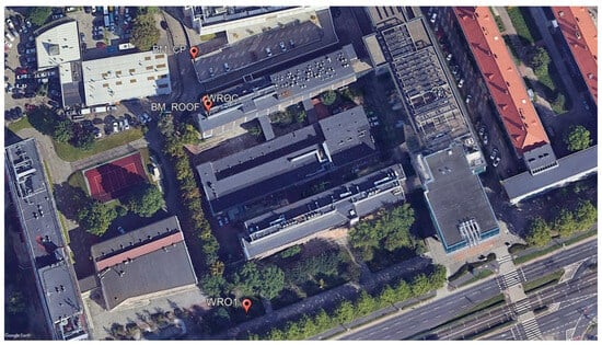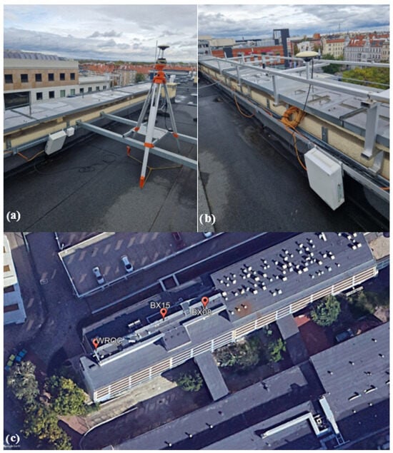 We designed the test base and established it by precise levelling. The test base was located around and on the roof of the C1 Building of the UPWr (Figure 2). The main aim of the precise levelling was to obtain the normal heights (H, Table 1) of established benchmarks with the greatest possible degree of accuracy, thereby facilitating subsequent surveys. The survey was conducted with an accuracy of 1.3 mm, i.e., we obtained such a difference between the leveling and known height of the WROC station.