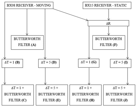 The vertical displacement detection was performed by the analysis of the time series of the vertical component or its derived products. Overall, ten different products (labeled A to J) were subjected to analysis. These time series were formed by the combination of time differentiation (ΔT, by 1 or 5 epochs), receiver differentiation (ΔR, between BX08 and BX15), and Butterworth filtering. The Butterworth filter high-pass setting was 0.01 Hz and was adjusted arbitrarily based on the previous experience of the authors. The rationale and labeling are explained in Figure 4.