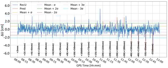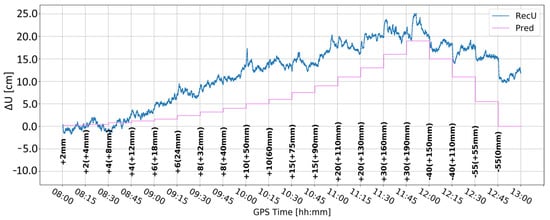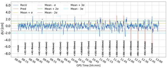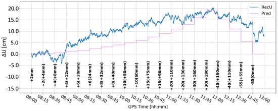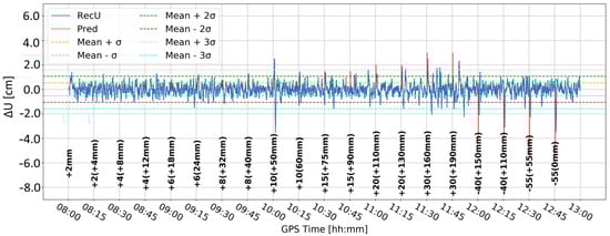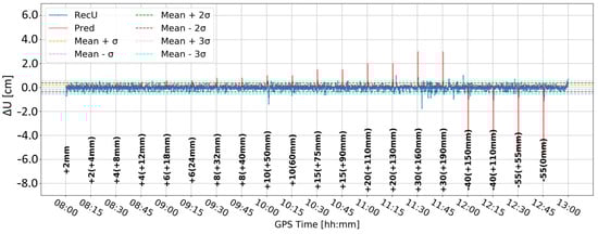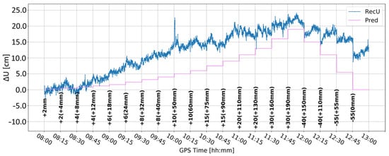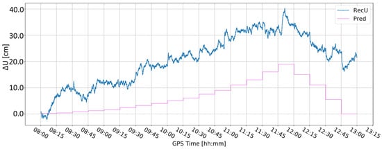 Figure 5 and Figure 6 present the change in the height component (∆U) with the application of two different levels of coordinate constraints, i.e., 0.01 (tight) and 1 m (loose), respectively. The loose constraints make the time series noisier and less similar to predicted displacements (Pred), drawn as the pink line, presenting the expected change in the height component. On the other hand, tight constraints resulted in a smoother time series, which changed rapidly during the simulated displacements of tens of mm. Moreover, the PPP filter excluded several GPS satellites around 10:00 and 12:00, resulting in large peak/discontinuity in the time series, which is suppressed in the tightly constrained solution. Therefore, it was concluded to continue with tight constraining of the coordinates.