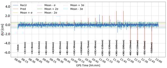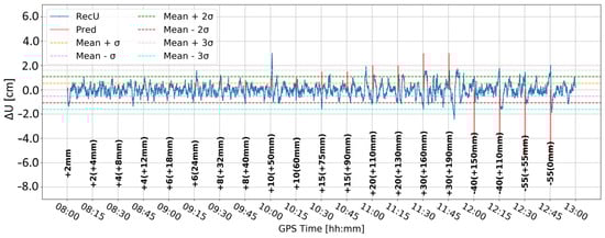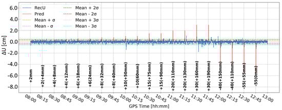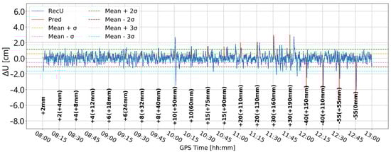 Time series A (Figure 8) was obtained by Butterworth filtering of the original time series. It was the one in which large variation in the vertical component is clearly visible. Some large deformation seemed to be visually detectable. However, since time series A was noisy, it was difficult to clearly distinguish between correct and false alarms. Time series B (Figure 9) resulted from time differentiation by one epoch (5 s). Several peaks appeared that exceeded the three-sigma level, but only some of them coincided with the real deformation epochs. The combined product, i.e., time series C (Figure 10), merged both methods, i.e., firstly the time series was differenced, and then, filtered, remained similar to time series B, suggesting that time differentiation by one epoch impacted the time series more than filtering.