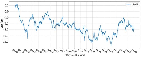Figure 7 presents the change in the vertical component when the elevation cut-off angle is set to 20°. Compared to the 10° elevation cut-off angle (Figure 5), the time series is closer to the expected position. Nevertheless, at 8:30 an unexpected fault appears, which is bigger than in Figure 5, even though the values in the range 11:45–12:00 are the same for both lines. Moreover, the character of the time series obtained with a 10° elevation cut-off angle seems to better reflect the expected deformations. Therefore, it was arbitrarily decided to proceed with a 10° elevation cut-off angle.