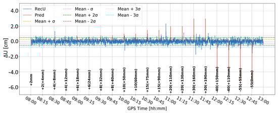 Figure 11 and Figure 12 present analogous solutions to the ones presented in Figure 9 and Figure 10. The only difference involved changing the time-differentiation interval from one epoch to five epochs (25 s). Such a change was motivated by the Kalman filter characteristics and stochastic modeling, which may prevent immediate update of the coordinates. As expected, the resulting time series had a wider range of values and larger sigma levels. Both time series are similar to each other. Nevertheless, multiple peaks coincided with the real deformation epochs, particularly for deformation with amplitudes larger than 10 mm. Moreover, the number of false alarms was reduced in both cases. Such results suggested that a larger differentiation time helps to detect deformation, while the impact of Butterworth filtering is marginal.