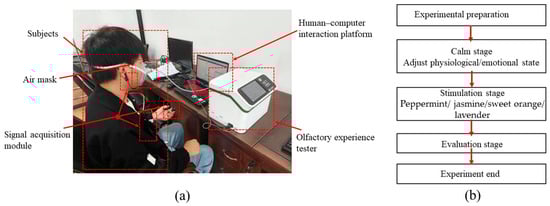 The experimental environment was chosen to be a well-ventilated laboratory with good lighting. During the experiment, the participants were instructed to remain still and silent. After completing one set of experiments, there was a 3 min break, during which the experimenter performed a series of tasks, such as changing the mask and purging the odor channel, to ensure that any residual odor from the previous set did not affect the next set. Additionally, the correctness of the device connection and the accuracy of the physiological data were verified before initiating a new experiment.