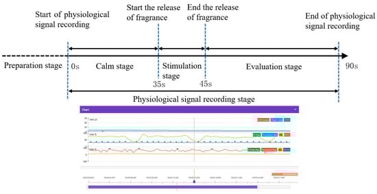 Each participant was required to complete four sets of experiments (peppermint, jasmine, sweet orange, and lavender), which were conducted in a random order. These experiments do not interfere with each other. A total of 132 samples were generated from thirty-three participants (as shown in Figure 2b). Each experiment was divided into four stages: the preparation stage, calm stage, stimulation stage, and subjective evaluation stage (as shown in Figure 3). During the preparation stage, participants were fitted with an odor mask and a physiological signal acquisition module, both of which were securely placed to avoid interfering with the participant’s movements. The experiment assistant then helped the participant adjust to a comfortable and sustainable posture. Once the participant was ready, physiological signals were recorded for 95 s. The first 35 s represent the calm stage, during which the participant’s physiological signals are maintained within a normal range. The physiological signals during the calm stage were used as a baseline, and each participant’s physiological signals were only compared to their own baseline, eliminating the impact of individual differences. From the calm stage, participants were asked to remain still and not speak, to ensure that the signal changes during the stimulation stage were caused by the fragrance. From 35 s to 45 s, an odor was released, allowing the participant to experience experimental odors. Finally, from 45 s to 95 s, the subjective evaluation of the participant was collected. This evaluation had two indicators: “like” and “disgust”, from which participants needed to choose according to their own experiences. In addition, physiological data of all subjects were collected from 9:00 am to 11:00 am on the test day.